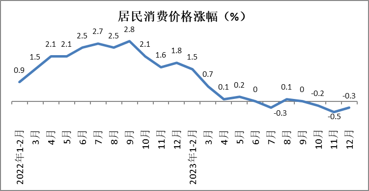 12月份,全国居民消费价格(CPI)同比下降0.3%,降幅较11月份收窄0.2个百分点。2023年,全国居民消费价格比上年上涨0.2%,呈平稳上涨态势。其中,食品类价格下降0.3%,非食品类价格上涨0.4%;消费品价格下降0.3%,服务类价格上涨1%。