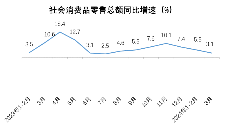 3月份,社会消费品零售总额39020亿元,同比增长3.1%,增速较1-2月份累计增速放缓2.4个百分点。一季度,社会消费品零售总额120327亿元,同比增长4.7%。