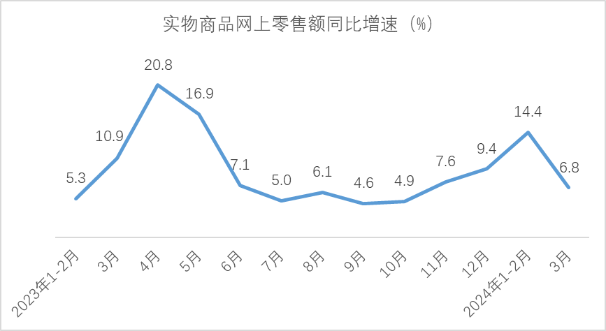 3月份,实物商品网上零售额实现9847亿元,同比增长6.8%,增速较1-2月份累计增速放缓7.6个百分点。一季度,实物商品网上零售额28053亿元,增长11.6%,占社会消费品零售总额的比重为23.3%,占比较1-2月份提高0.9个百分点。