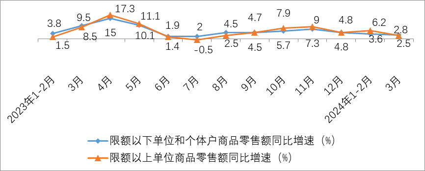 据测算,3月份,限额以下单位和个体户商品零售额实现20695亿元,同比增长2.8%,增速较1-2月份放缓0.8个百分点,快于限额以上单位商品零售额增速0.3个百分点。一季度,限额以下单位和个体户商品零售额实现64982亿元,累计增长3.4%,慢于限额以上单位商品零售额增速1.5个百分点。