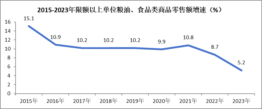 2015年至2019年,限额以上单位粮油、食品类商品零售额增速保持在10%以上的平稳较快增长,但在2020年后,疫情对居民消费能力、商品流通渠道、零售终端创新等造成冲击,粮油、食品类商品零售额增速放缓至10%以下。虽然2021年增速有所回升,但2022年、2023年增速持续放缓,其中,2023年限额以上单位粮油、食品类商品零售额同比增长5.2%,增速较2022年放缓3.5个百分点。