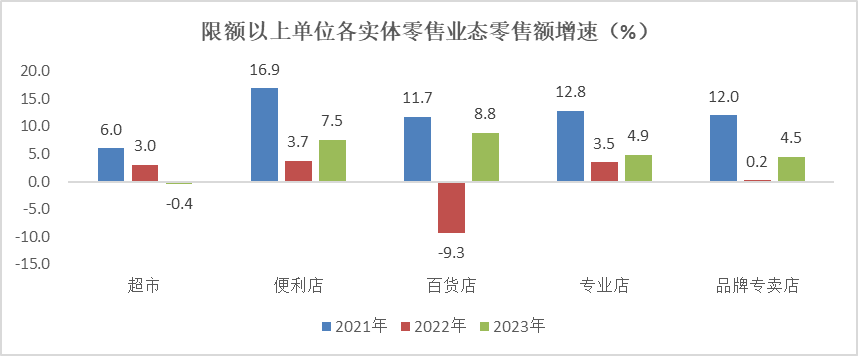 图表 3? 2021-2023年限额以上单位不同零售业态零售额增速(%)
