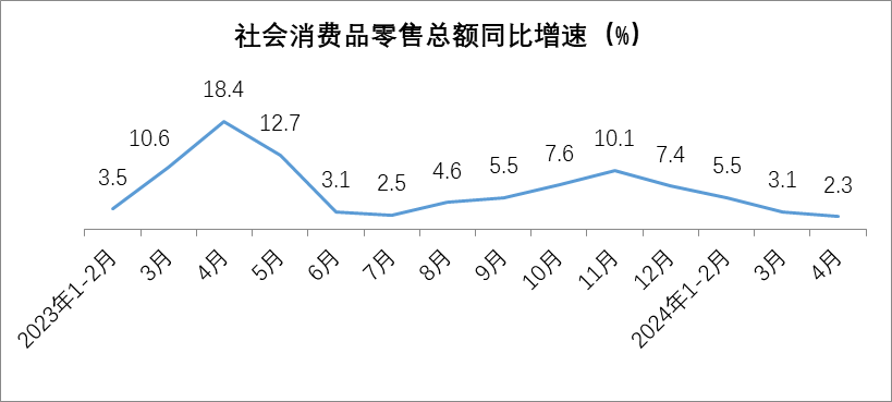 4月份,社会消费品零售总额35699亿元,同比增长2.3%,增速较3月份放缓0.8个百分点。1-4月份,社会消费品零售总额156026亿元,累计增长4.1%,增速较一季度放缓0.6个百分点。