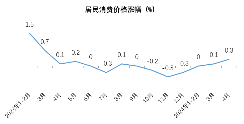 4月份,全国居民消费价格同比上涨0.3%,涨幅较3月份扩大0.2个百分点。其中,食品价格下降2.7%,降幅环比持平,非食品价格上涨0.9%,涨幅环比扩大0.2个百分点;消费品价格持平,涨幅环比扩大0.4个百分点,服务价格上涨0.8%,涨幅环比持平。1-4月平均,全国居民消费价格比上年同期上涨0.1%,涨幅较一季度扩大0.1个百分点。