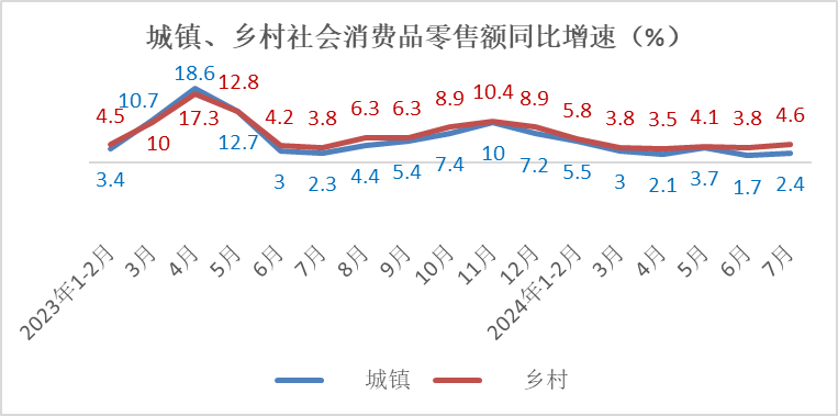 7月份,城镇消费品零售额32691亿元,同比增长2.4%,增速较6月份加快0.7个百分点;乡村消费品零售额5066亿元,同比增长4.6%,增速较6月份加快0.8个百分点,乡村消费品市场增速快于城镇2.2个百分点。1-7月份,城镇消费品零售额237250亿元,累计增长3.4%,增速较上半年放缓0.2个百分点;乡村消费品零售额36476亿元,累计增长4.5%,增速与上半年持平,乡村消费品市场增速快于城镇1.1个百分点。