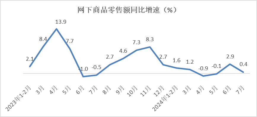 根据测算,7月份网下商品零售额同比增长0.4%,增速较6月份放缓2.5个百分点。1-7月份,网下商品零售额累计增长1%,增速较上半年放缓0.1个百分点。按零售业态分,上半年,限额以上零售业单位中便利店、专业店、超市零售额同比分别增长5.2%、4.5%、2.0%;百货店、品牌专卖店零售额分别下降3.8%、1.6%。