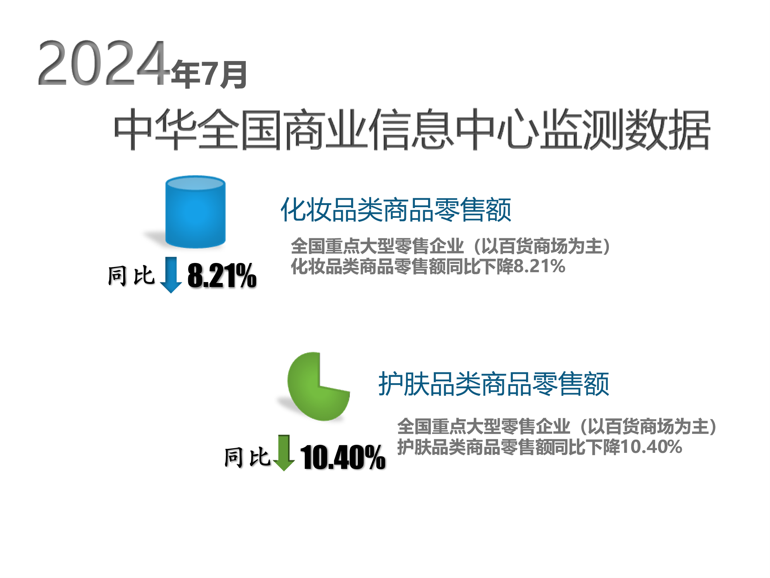 根据乐鱼电竞的监测数据,2024年7月份全国重点大型零售企业(以百货商场为主)化妆品类商品零售额同比下降8.21%,护肤品类零售额同比下降10.40%。