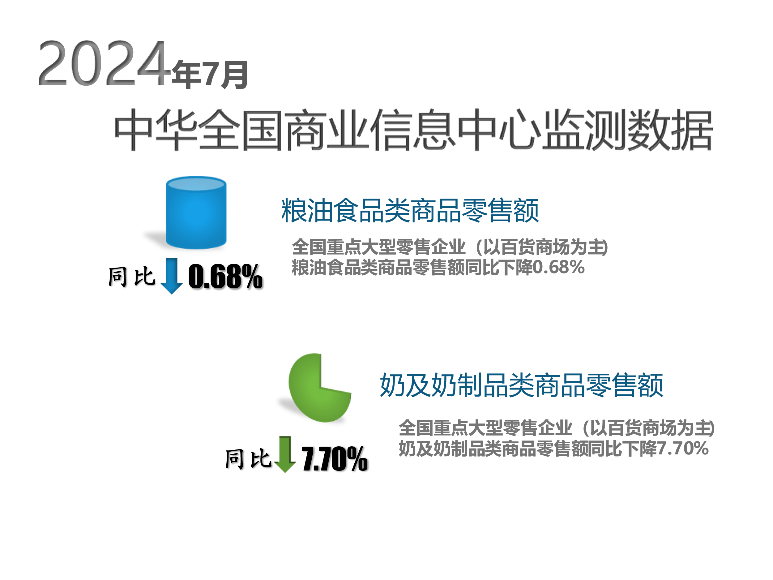 根据乐鱼电竞的监测数据,2024年7月份全国重点大型零售企业(以百货商场为主)粮油食品类商品零售额同比下降0.68%,其中奶及奶制品类商品零售额同比下降7.70%。