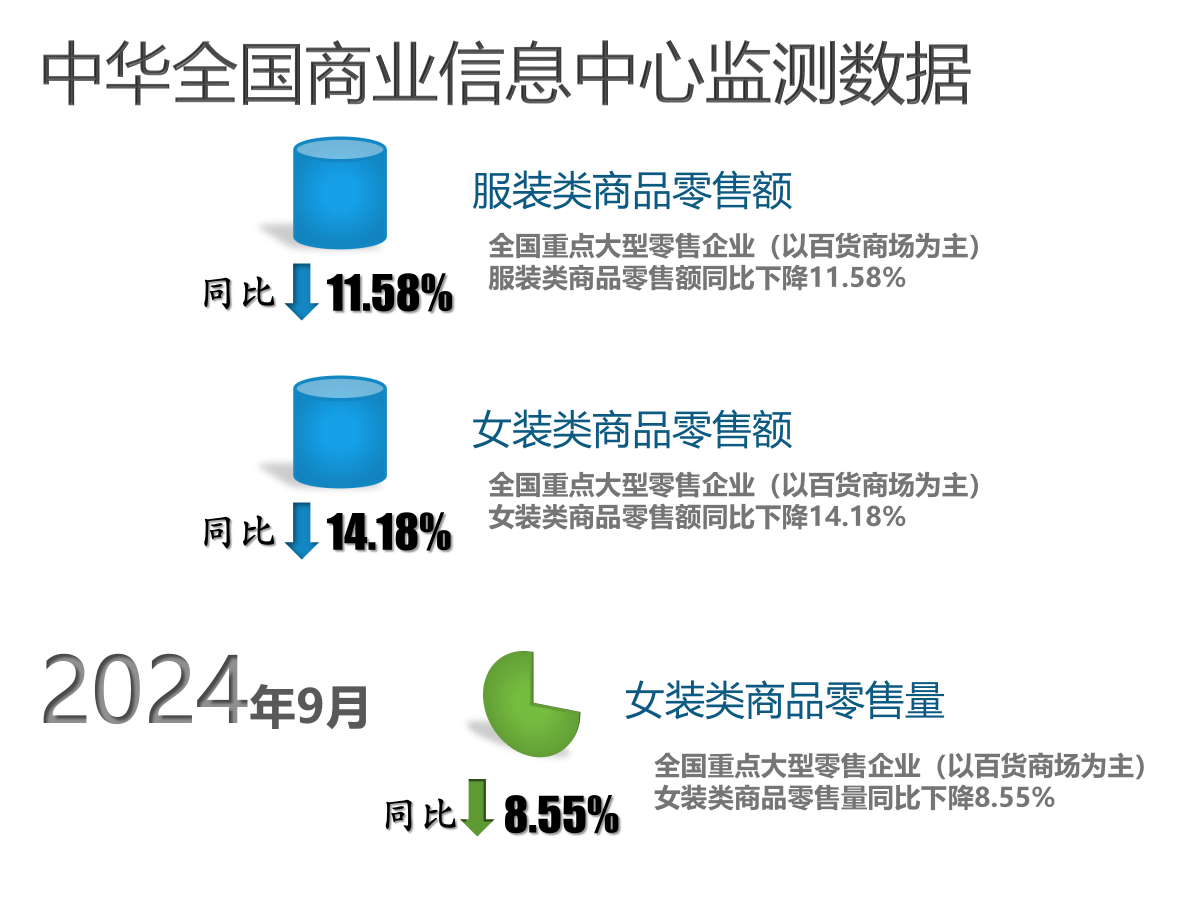 根据乐鱼电竞的监测数据,2024年9月份全国重点大型零售企业(以百货商场为主)服装类商品零售额同比下降11.58%,女装类商品零售额同比下降14.18%,女装类商品零售量同比下降8.55%。