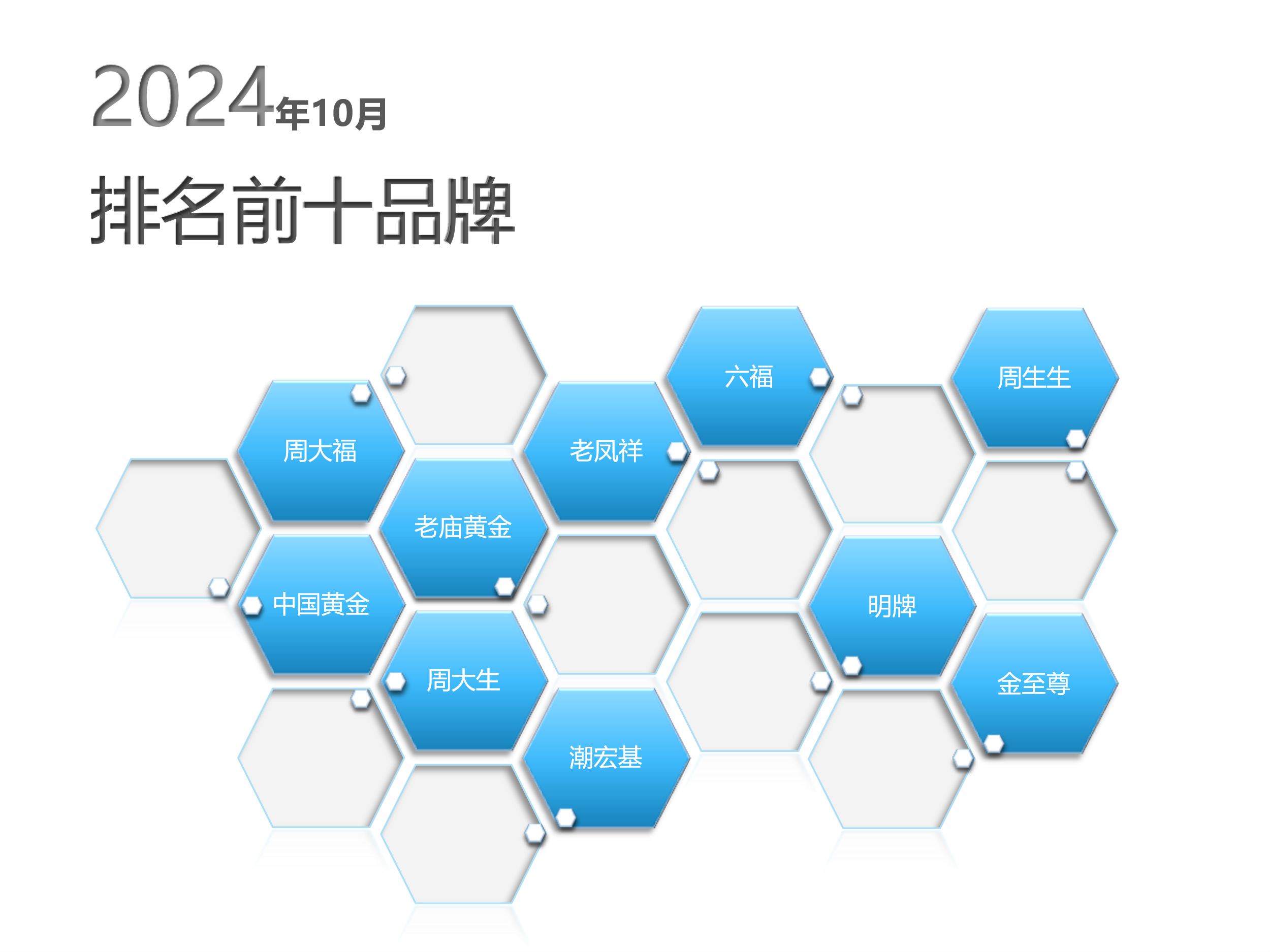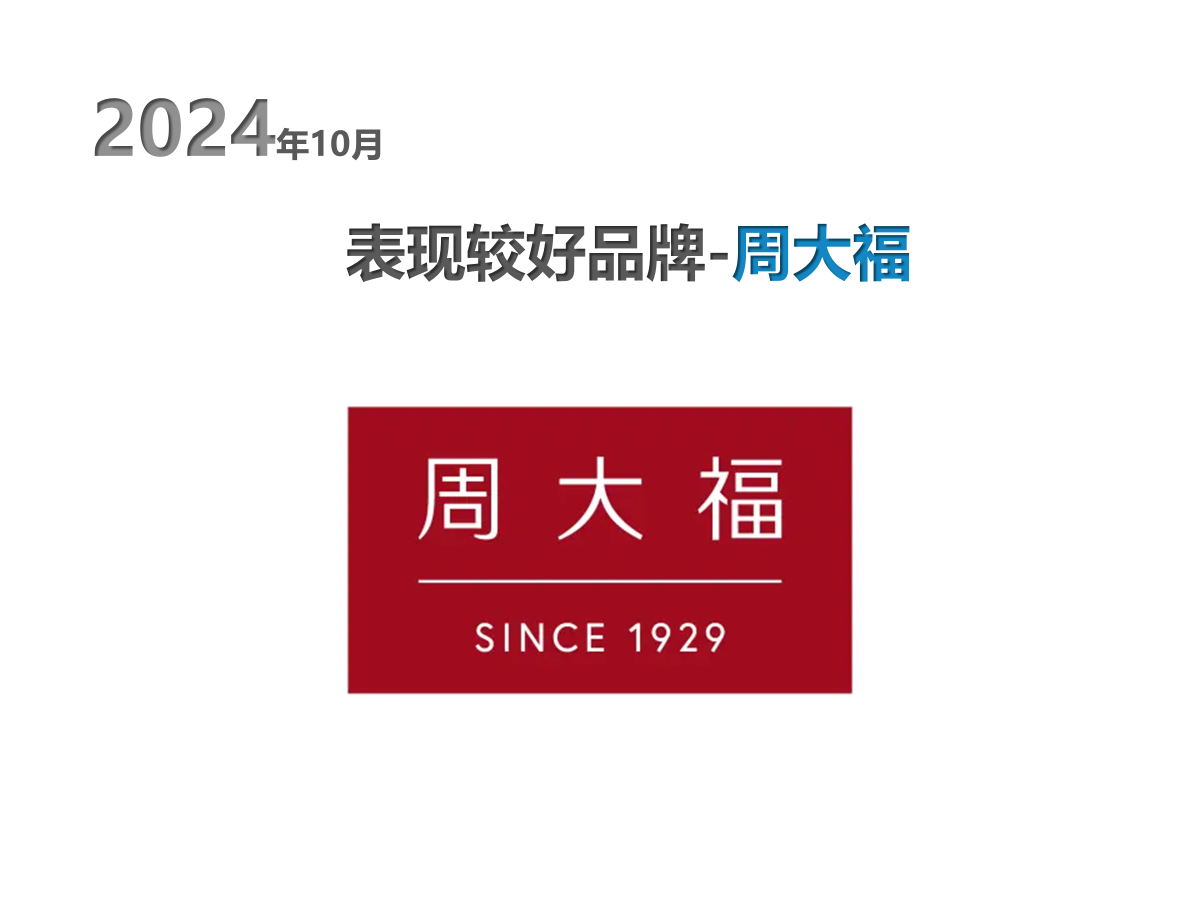 从10月份品牌数据来看,珠宝首饰销售前十位品牌包括周大福、老庙黄金、老凤祥、六福、周生生、中国黄金、周大生、潮宏基、明牌和金至尊。这些优势品牌的市场综合占有率整体有所增长,根据统计,10月前十位品牌市场综合占有率的和为64.38%,与去年同期相比增长2.56个百分点,环比提高1.03个百分点。2024年10月前十品牌中,周大福表现较好,市场综合占有率与同期相比提高了1.41个百分点。