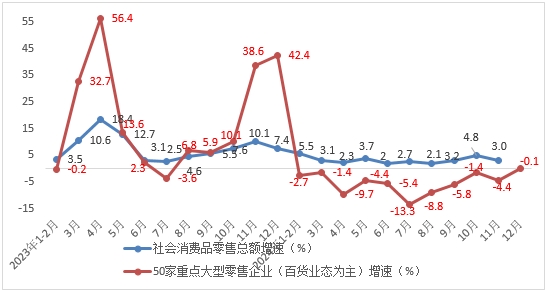 根据乐鱼电竞的监测数据,2024年全年全国重点大型零售企业零售额同比下降4.3%。其中,12月份全国50家重点大型零售企业(以百货业态为主)零售额基本与上年同期持平,增速为-0.1%,降幅相比上月收窄了4.3个百分点,也明显好于今年其他月份。