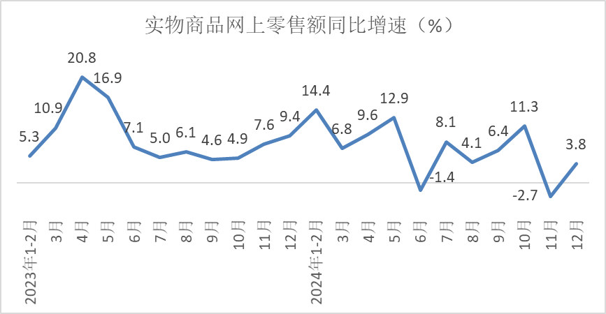 根据测算,12月份实物商品网上零售额同比增长3.8%,增速较11月份提升6.5个百分点。2024年,直播带货、即时零售等电商新模式持续拓展,带动线上消费增长作用明显。实物商品网上零售额130816亿元,同比增长6.5%,增速快于消费品市场整体增速3个百分点,实物商品网上零售额占社会消费品零售总额的比重为26.8%,占比较前11月提高0.1个百分点。在实物商品网上零售额中,吃类、穿类、用类商品分别增长16.0%、1.5%、6.3%。