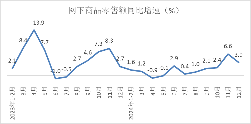 12月份,商品零售39623亿元,同比增长3.9%,增速较上月加快1.1个百分点;餐饮收入5549亿元,同比增长2.7%,增速较上月放缓1.3个百分点,商品零售增速快于餐饮收入1.2个百分点。2024年,商品零售432177亿元,同比增长3.2%,增速与前11月基本持平;餐饮收入55718亿元,同比增长5.3%,增速较前11月放缓0.4个百分点。