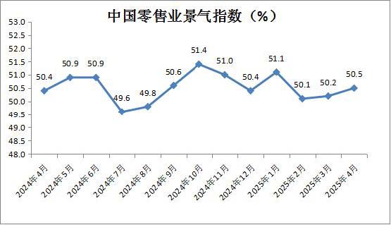 4月份,中国零售业景气指数(CRPI)为50.5%,环比微升0.3个百分点,维持在扩张区间运行。其中,商品经营类指数为50.1%,环比微升0.2个百分点,重回扩张区间;租赁经营类指数为52.7%,环比上升1.3个百分点,保持中高位景气区间运行;电商经营类指数为50.1%,与上月持平。3月中旬,中共中央办公厅、国务院办公厅印发《提振消费专项行动方案》,围绕提升消费能力、优化消费环境、增强消费意愿、破解制约消费的突出矛盾,决策部署一系列重要举措,促使我国消费市场正积极释放“促升级、扩规模、提能级”的叠加效应,入境消费扩容提质与本土消费潜力深挖双向突破,零售业显现出对“政策红利持续增强,消费需求梯次激活”的良好市场预期。另一方面,面对外部关税上涨和政策反制等扰动因素,4月份我国零售业也存在结构调整需求和发展不确定性。