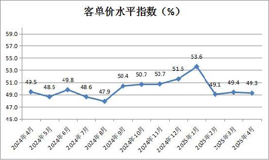 客单价水平指数为49.3%,较上月微降0.1个百分点,连续三个月处于荣枯线下方。分析认为,线下商品客单价水平持续低位运行,表明我国居民消费能力和消费信心有待提升的问题,值得持续关注。