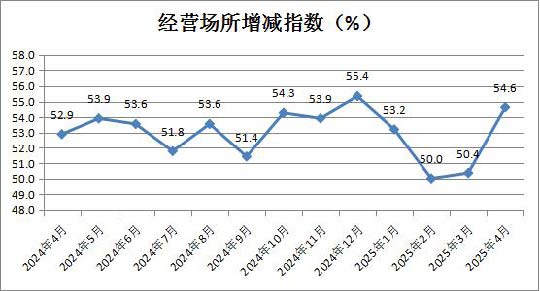 经营场所增减指数为54.6%,较上月大幅上升4.2个百分点,表明4月份租赁经营类企业新开店预期持续向好,投资意愿增强。