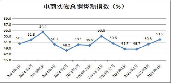 电商实物总销售额指数为51.9%,较上月持续上升1.6个百分点。分析认为,电商春季促销活动带动销售保持活跃,网络零售景气度稳定上行。