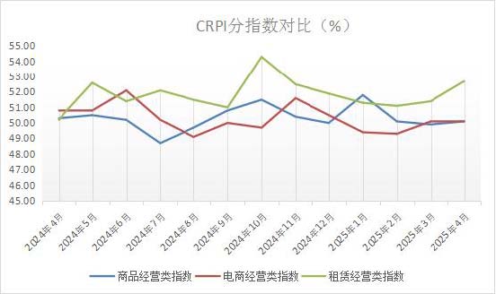 (一)CRPI三个分指数对比显示,4月份零售业整体表现向好,租赁经营类指数景气度持续高企,电商经营类指数持平,商品经营类指数略有回升,体现出线上线下商品经营预期均有不同程度的改善。