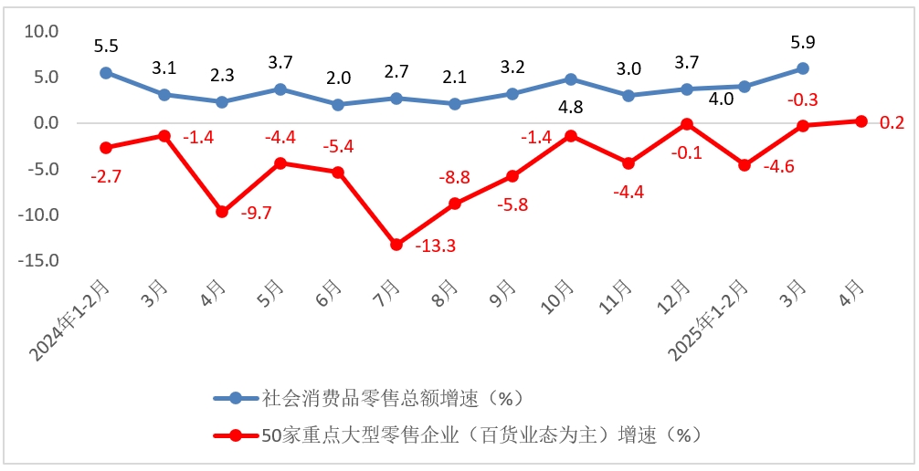 根据乐鱼电竞的监测数据,2025年4月份全国50家重点大型零售企业(以百货业态为主)零售额同比增长0.2%,增速环比提高了0.5个百分点。
