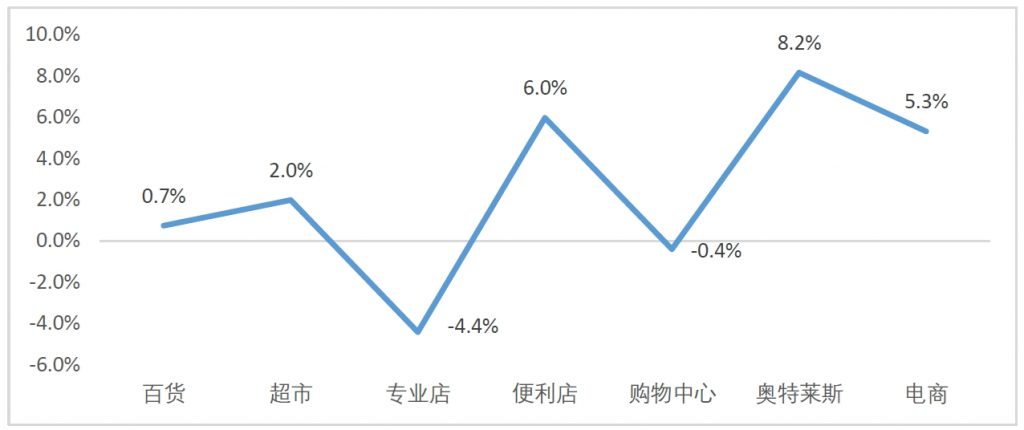在理性消费、品质消费、体验消费为主流的消费市场环境下,具有高质价比、高便捷度、高体验感特征的零售业态依然具有较为明显的差异化竞争优势。根据国家统计局数据,2024年限额以上零售业实体店中,以品质优、体验佳为代表的仓储会员店零售额保持两位数增长。与之类似,在商业零售TOP100企业中,兼具高品质、大折扣、强体验特点的奥特莱斯零售企业销售规模同比增长8.2%,持续较快增长;2024年限额以上零售业实体店中,便利店零售额同比增长4.7%,商业零售TOP100企业中,以便利店为主的零售企业销售规模亦实现6.0%的较快增长。以基本生活类消费为主,且数字化转型较为成熟的超市业态保持平稳增长。2024年限额以上零售业实体店中,超市零售额同比增长2.7%。在商业零售TOP100企业中,以超市为主的零售企业销售规模同比增长2.0%。百货业在2024年依然存在同质化竞争程度较大及消费信心不足的挑战。限额以上零售业实体店中,百货店零售额同比下降2.4%。商业零售TOP100企业中,以百货为主的零售企业销售规模同比增长0.7%,以购物中心为主的零售企业销售规模同比下降0.4%。
