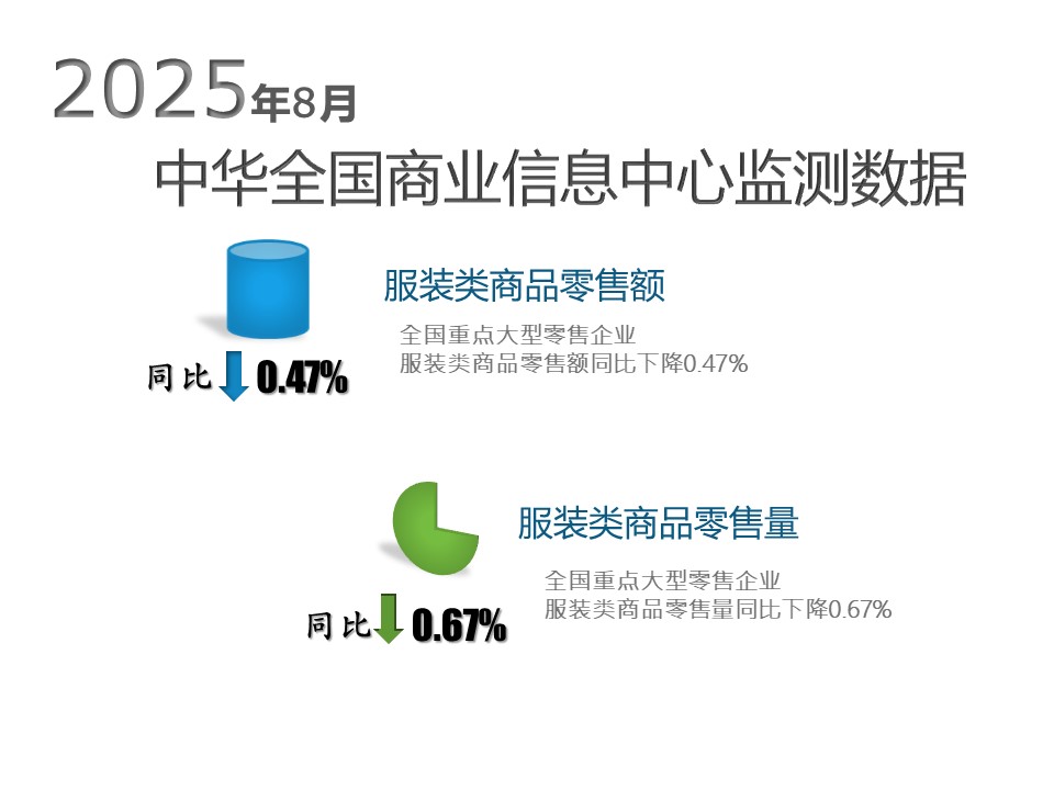 根据乐鱼电竞的监测数据,2025年8月份全国重点大型零售企业(以百货集团企业为主)服装类商品零售额同比下降0.47%,零售量同比下降0.67%。运动服类商品零售量同比下降0.71%。