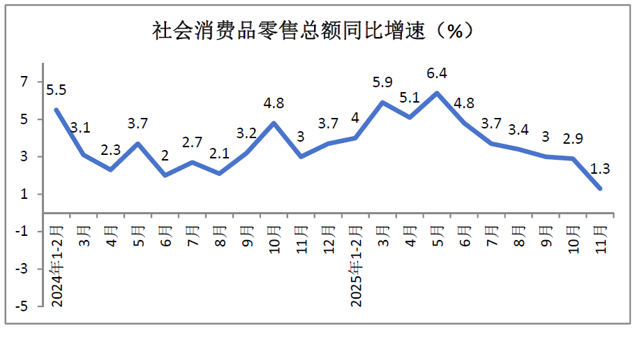 11月份,社会消费品零售总额实现43898亿元,受去年同期基数较高以及“双十一”促销提前等因素影响,同比增长1.3%,增速比上月回落1.6个百分点。今年以来,一系列提振消费政策协同发力,消费市场持续平稳增长,1-11月份,社会消费品零售总额456067亿元,增长4.0%,增速相比上年同期、上年全年均加快了0.5个百分点。