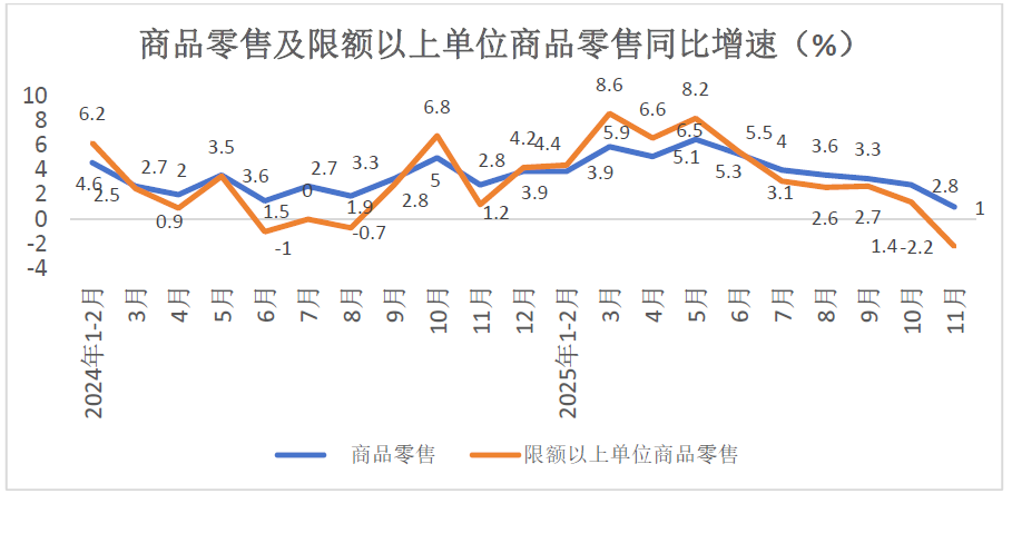 11月份,商品零售额37841亿元,同比增长1.0%,增速较10月份放缓1.8个百分点。其中,限额以上单位商品16430亿元,同比下降2.2%,增速较10月份下降3.6个百分点。