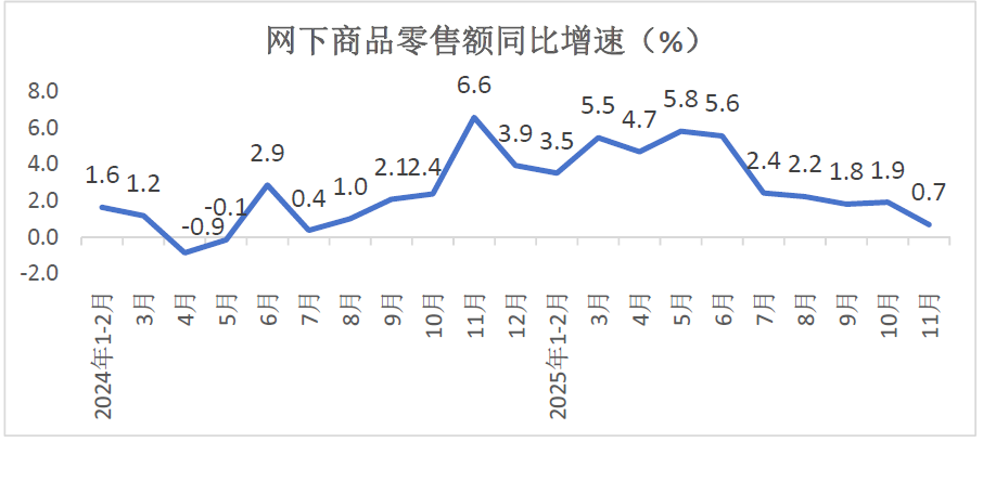根据测算,11月份,网下商品零售额同比增长0.7%,增速较10月份放缓1.2个百分点。1-11月份,网下商品零售额增长3.5%,增速较1-10月份放缓0.2个百分点。
