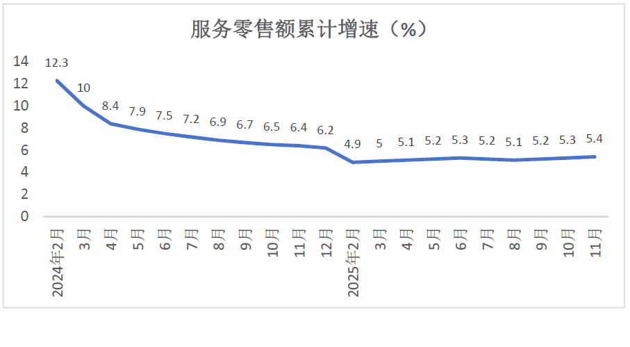 随着扩大服务消费政策进一步落地落细,居民消费潜力不断激发,服务消费市场保持较快增长。1-11月份,服务零售额同比增长5.4%,增速较1-10月份加快0.1个百分点,连续3个月回升,服务零售额快于同期商品零售额增速1.3个百分点,服务消费在全部消费中的比重提升。从服务消费结构看,一是文化体育等消费新场景新供给加快培育,促进了相关服务零售较快增长。1-11月份,文体休闲服务类零售额保持两位数增长,体育会展服务、体育用品及器材零售同比分别增长29.7%和6.6%,全国电影票房收入同比增长19.5%,观影人次增长20.3%。二是生活服务消费数字化应用场景不断拓展,信息服务消费持续快速增长。1-11月份通讯信息服务类零售额同比增长超过10%,较前10月份有所加快。此外,银发群体消费需求增加,带动养老服务需求多元增长。1-11月份,老年人养护、社会看护与帮助、疗养院服务消费同比分别增长33.6%、9.6%和14.6%。