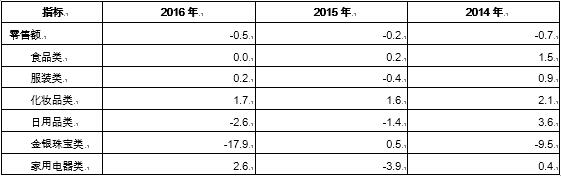 图表 1 2014-2016年全国50家大型零售企业商品销售增速(%)