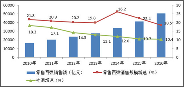 根据中国商业联合会、乐鱼电竞统计,2016年我国零售百强企业销售规模达到4.82万亿元,同比增长18.5%,较去年同期下降3.9个百分点,高于社会消费品零售总额增速8.1个百分点。