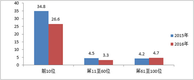 ??? 2016年我国零售百强企业中,前10名企业销售规模合计为33352.4亿元,占百强整体销售规模的比重为69.2%,比2015年上升3.4个百分点。2016年第11至第60位企业销售规模占比为25.0%,相比2015年下降2.9个百分点,第61至第100位企业销售规模占比为5.8%,相比2015年下降0.5个百分点。