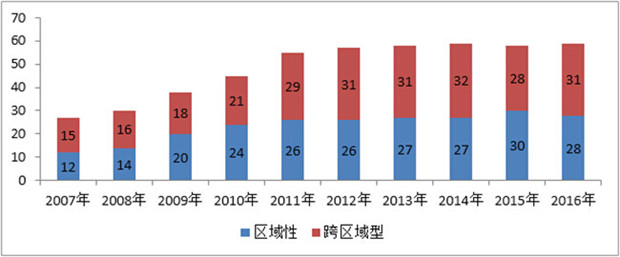图表12? 2007—2016年百亿级企业中跨区域企业与区域性企业数量(家)