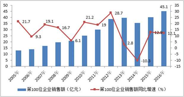 ??? 2016年零售百强入围门槛为45.1亿元,比2015年上升4.9亿元,第100位企业销售额比2015年第100位企业销售额高12.1%。