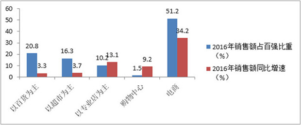 ??? 业态以专业店为主的企业有8家,销售规模占百强的10.2%,同比增速为13.1%,增速较2015年上升2.4个百分点,其中有1家企业出现负增长;业态以百货为主的企业共有49家,销售规模占百强的20.8%,同比增速为3.3%,比上年加快0.4个百分点,其中有20家企业出现负增长;业态以超市为主的企业共有27家,销售规模占百强的16.3%,同比增速为3.7%,比上年同期放缓0.5个百分点,其中有6家企业出现负增长;10家购物中心销售同比增长9.2%,规模占百强的1.5%;而6家电商的销售增速同比增长34.2%,销售规模占百强的51.2%。