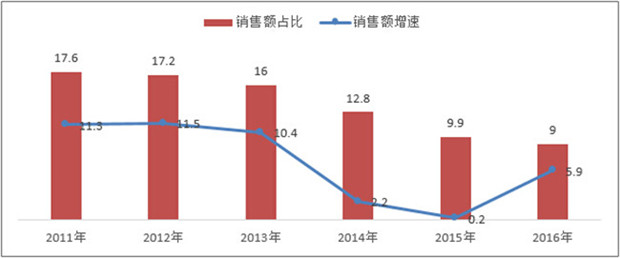图表17? 2011—2016年零售百强企业中外资零售企业(非电商)销售额占比及增速(%)