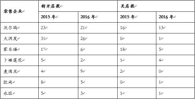 ??? 开店方面,除麦德龙新开店家数比2015年增多外,沃尔玛、大润发、家乐福等外资零售巨头新开店家数均少于2015年,其中家乐福仅新开6家门店,比上年大幅减少11家,是新开门店数下滑最快的外资企业。