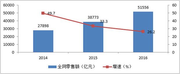 据国家统计局数据,2016年全国网上零售额51556亿元,同比增长26.2%,相比2015年下降7.1个百分点,相比2014年下降23.5个百分点。