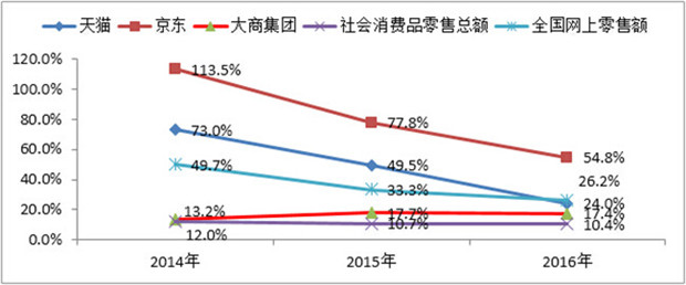 ??? 天猫作为中国最大B2C零售平台,2016年销售规模达到1.42万亿元,在百强中排名第一,销售规模同比增长24.0%,近年天猫销售增速急剧下滑,2016年销售规模增速不到2014年的1/3;