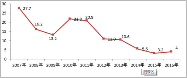 图表9? 2007-2016年零售百强企业销售规模所占比重(%)