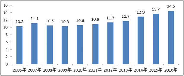 图表8? 2006-2016年零售百强销售规模占社会消费品零售总额的比重(%)